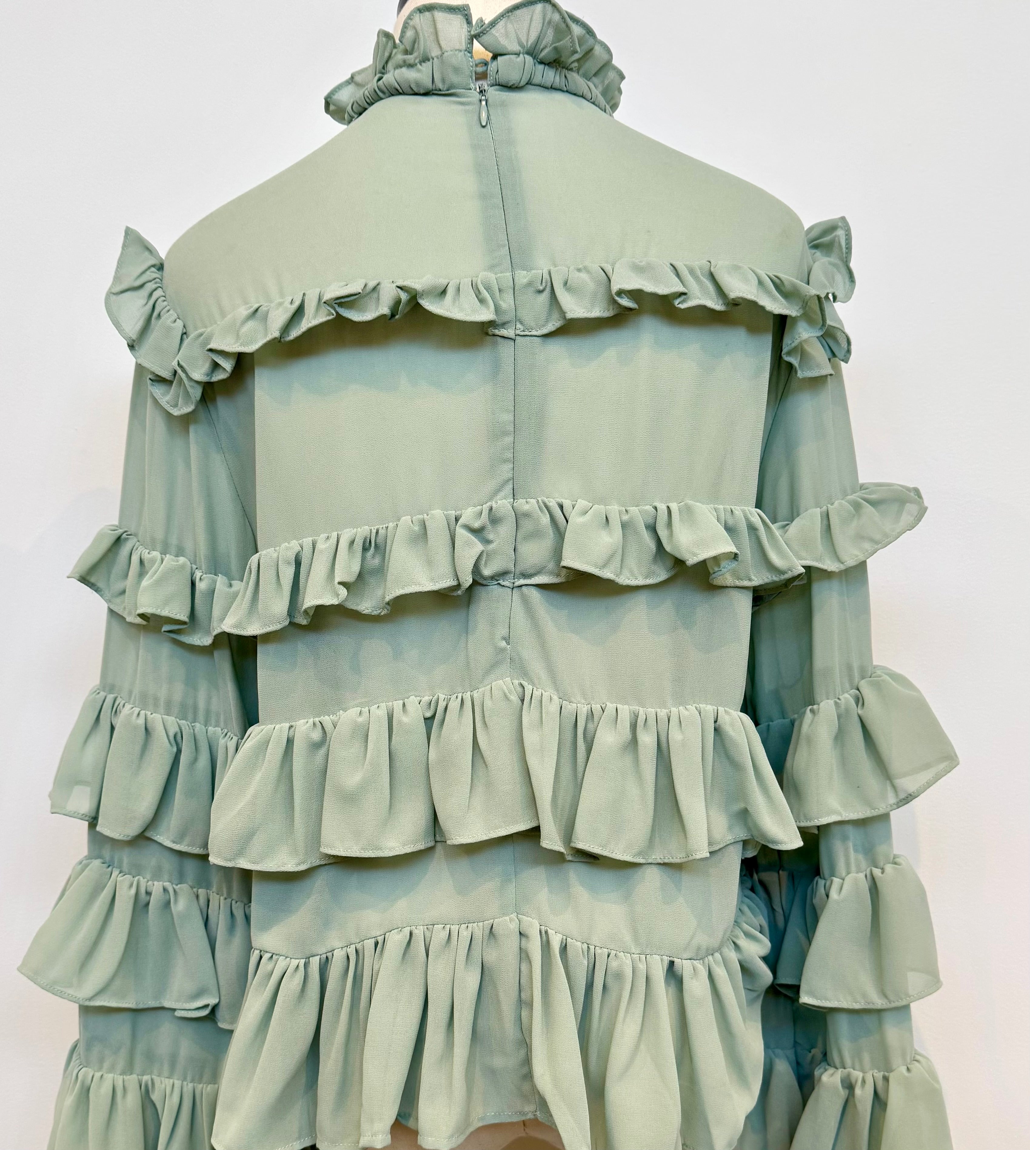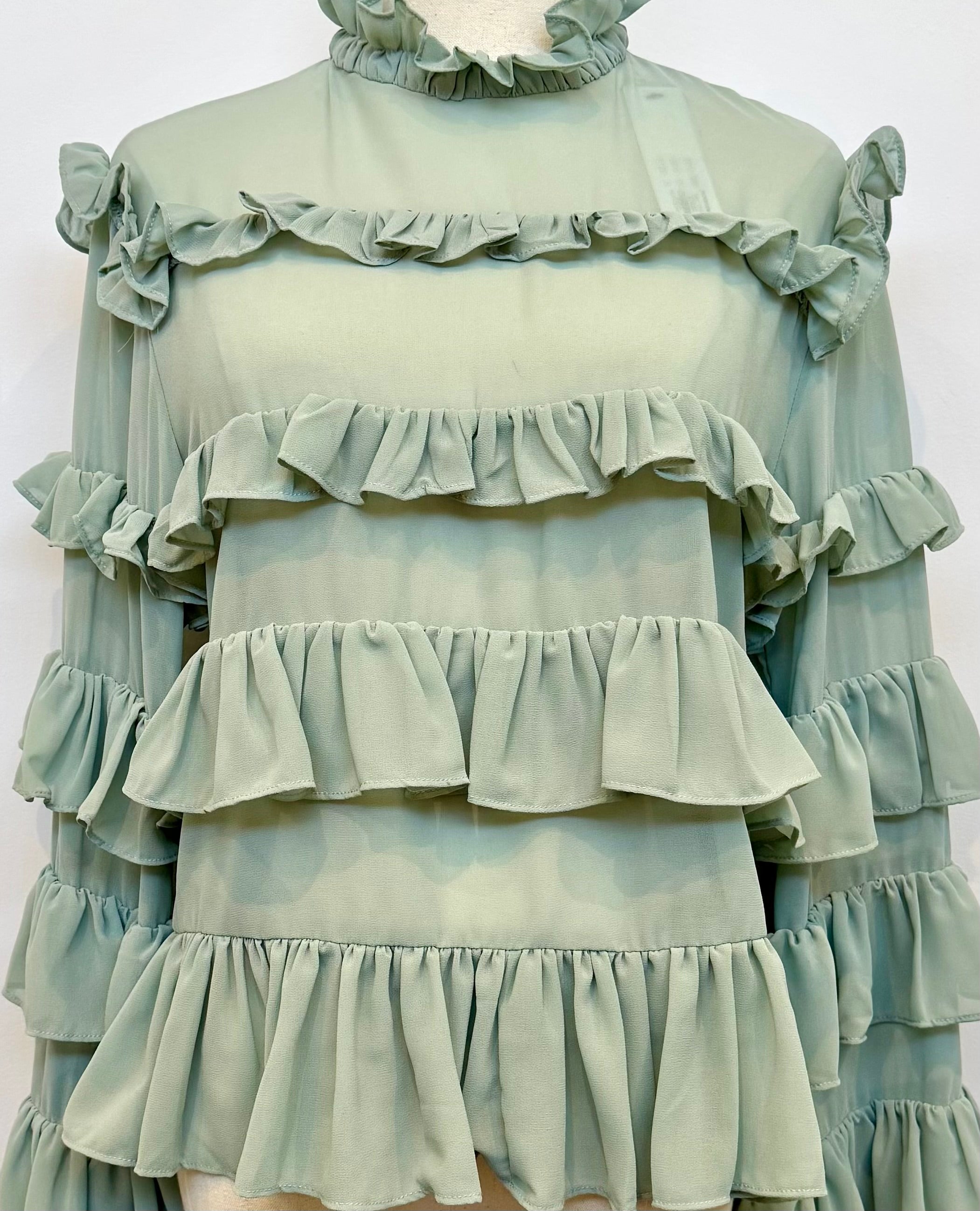 Introducing the latest must-have for the season - the High Neck Tiered Ruffle Blouse. With layer os ruffles in a chic sage green, this blouse exudes elegance and sophistication. Perfect for the fashion-forward lady, this blouse is a must-have for any stylish wardrobe. Currently wearing it means being on top of the style game!