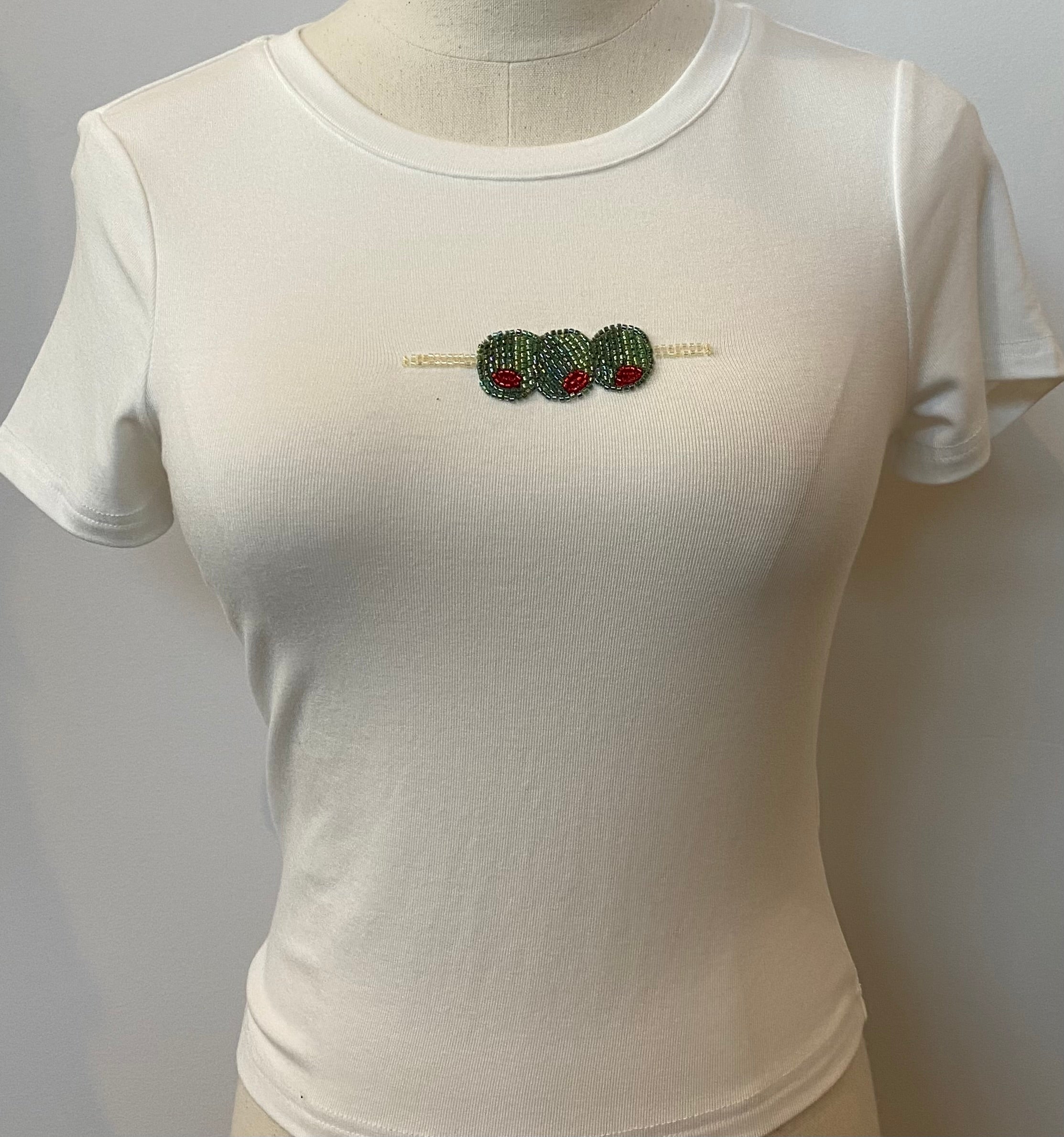 Shake up your wardrobe with our Olives Bead Tee! This snug-fitting graphic tee features a playful beaded martini olive design that's sure to stir conversations. Perfect for cocktail lovers and fashion enthusiasts alike – because who doesn't love a little fashion with their martini?