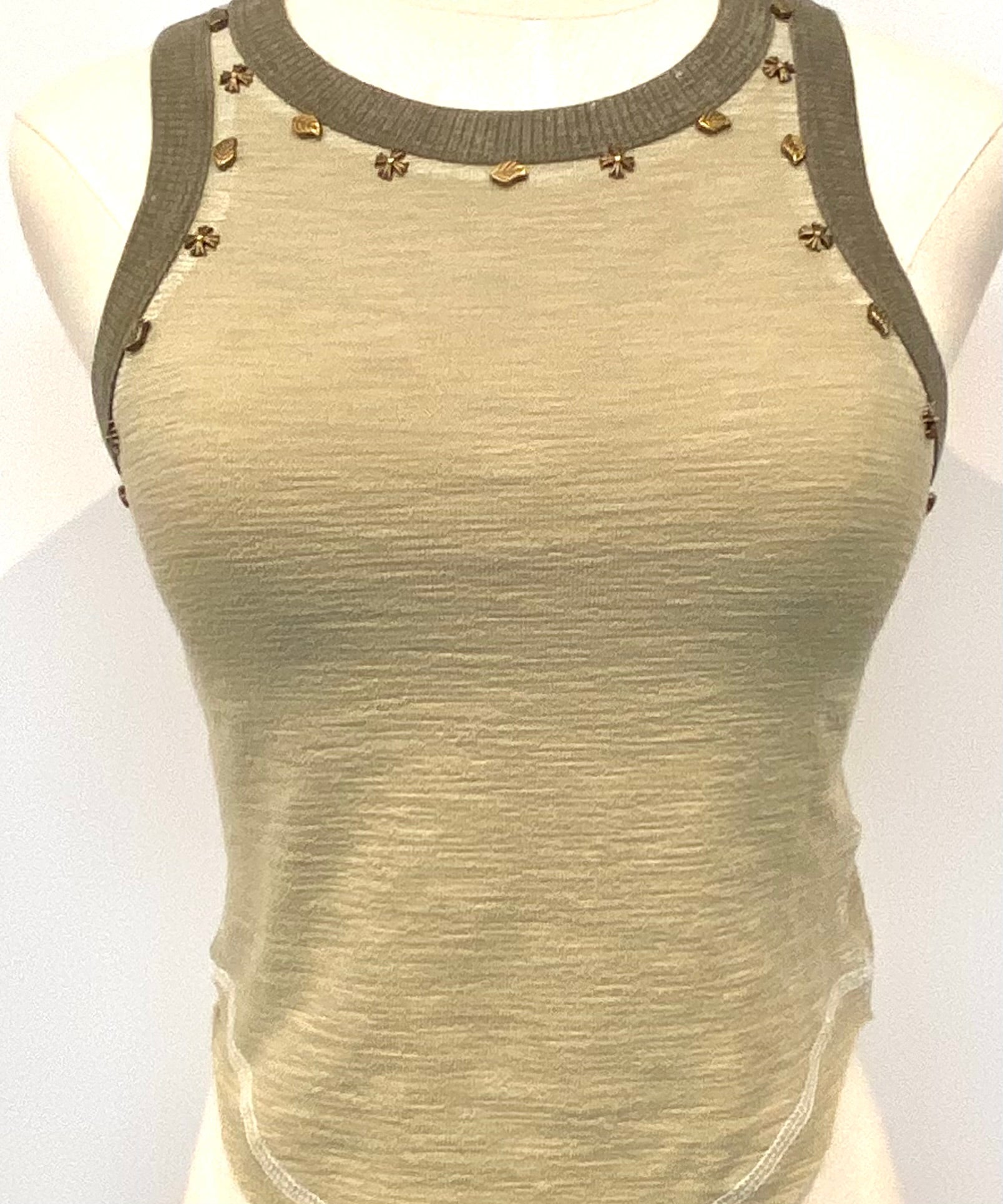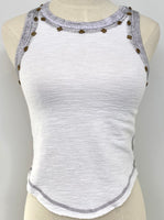 Get ready to have fun in the playful Rivet Detail Tank Top! With rivet details and a rounded hem, this top adds an edgy twist to your wardrobe. Perfect for a night out or a casual day, this tank will keep you stylish and comfortable