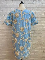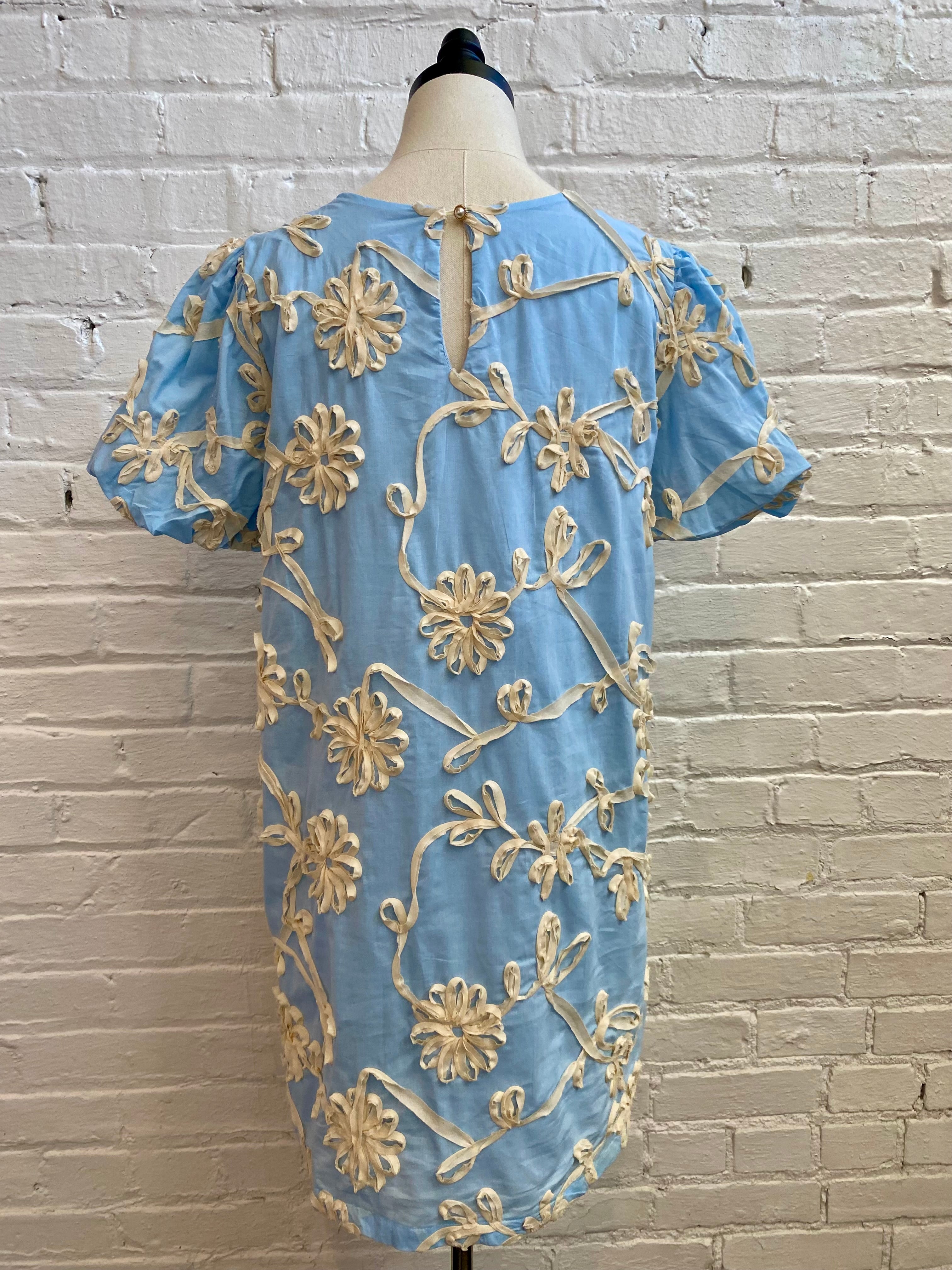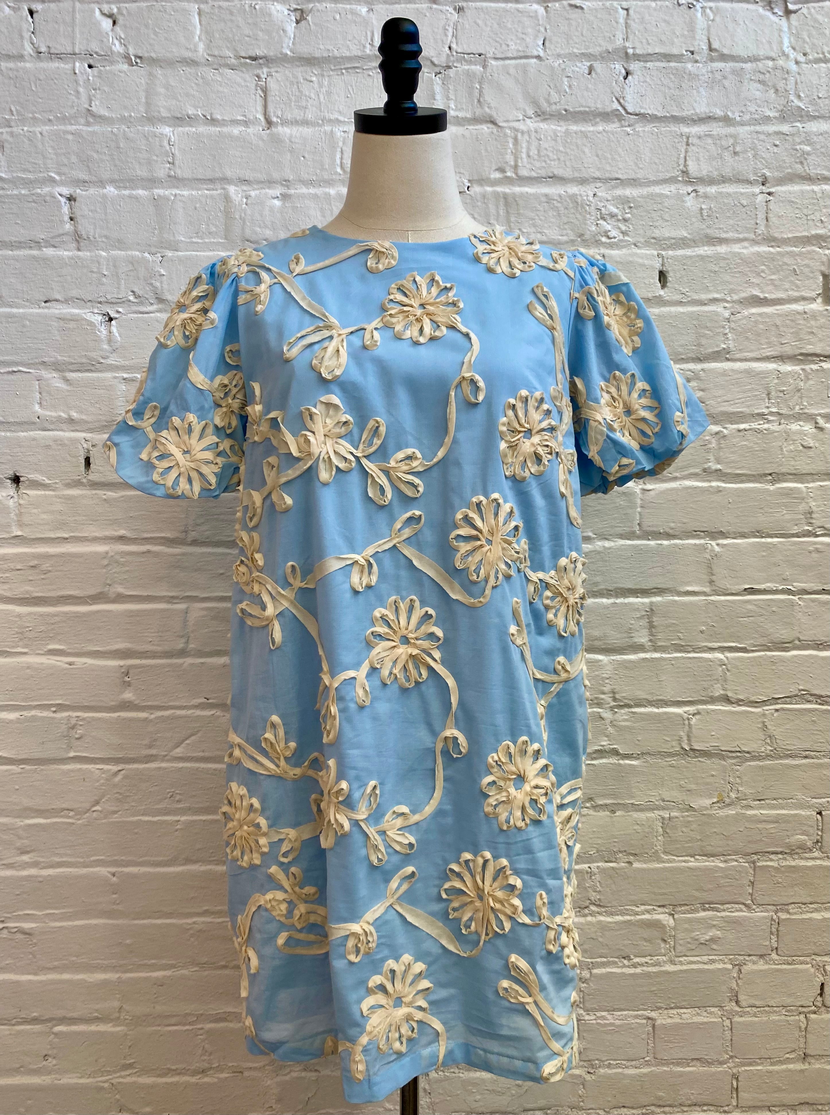 Elevate your daytime wardrobe with the Rosetta Detail Dress, a charming piece designed for lunch, brunch, and everyday elegance. Featuring a delicate light blue fabric with white floral embellishments and romantic puff sleeves. This dress combines feminine details with versatile styling. Perfect for pairing with your favorite shoes, it's an effortless choice for occasions that call for polished, put-together style.