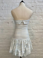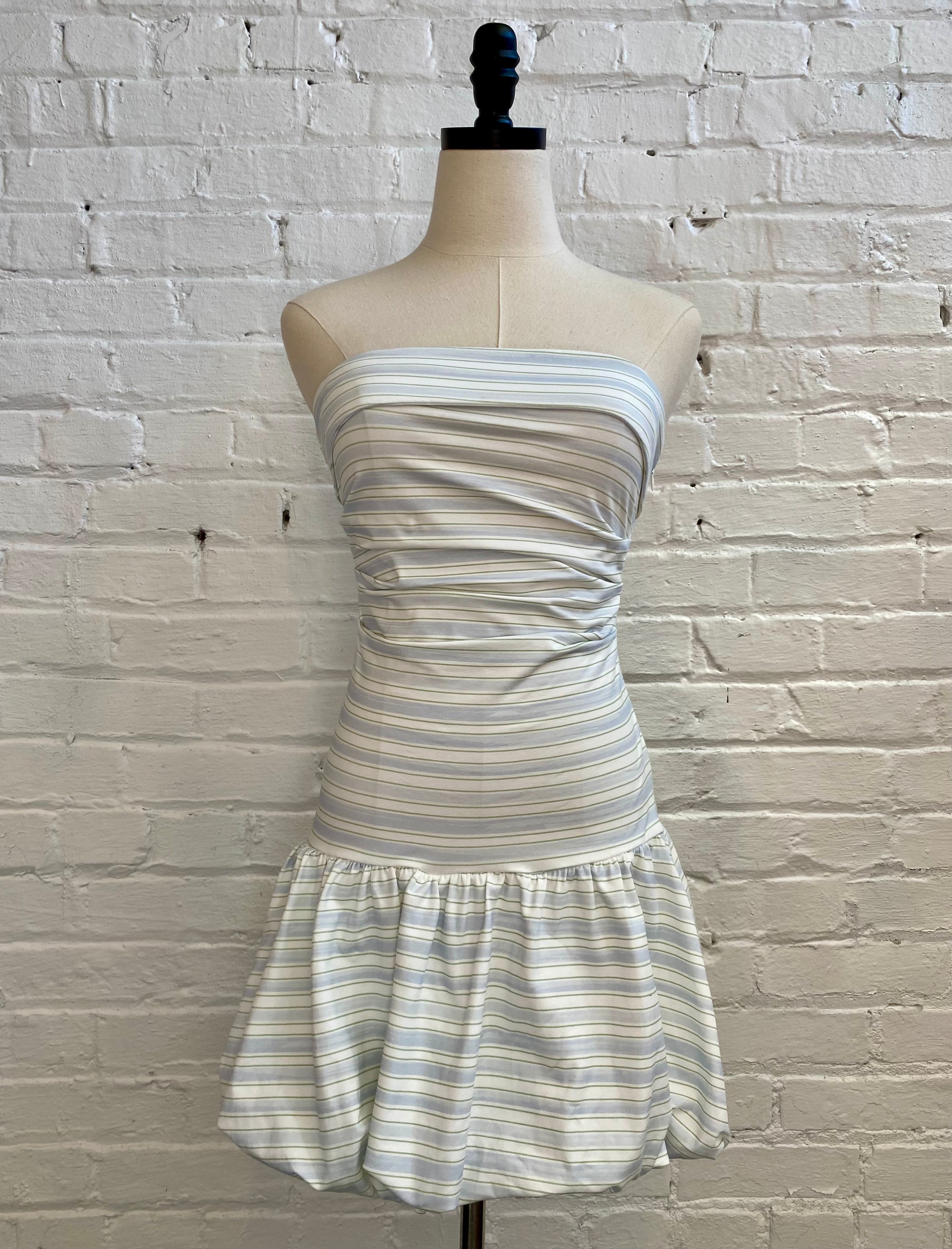 Effortless elegance meets playful style with this strapless bubble hem dress. Softblue and ivory stripes create a versatile look that transitions seamlessly from day to night. The structured bubble hem adds dimension and movement, while the strapless silhouette offers a modern, fashion-forward appeal. Perfect for warm-weather occasions, brunch dates, or casual outings where you want to look polished without trying too hard.