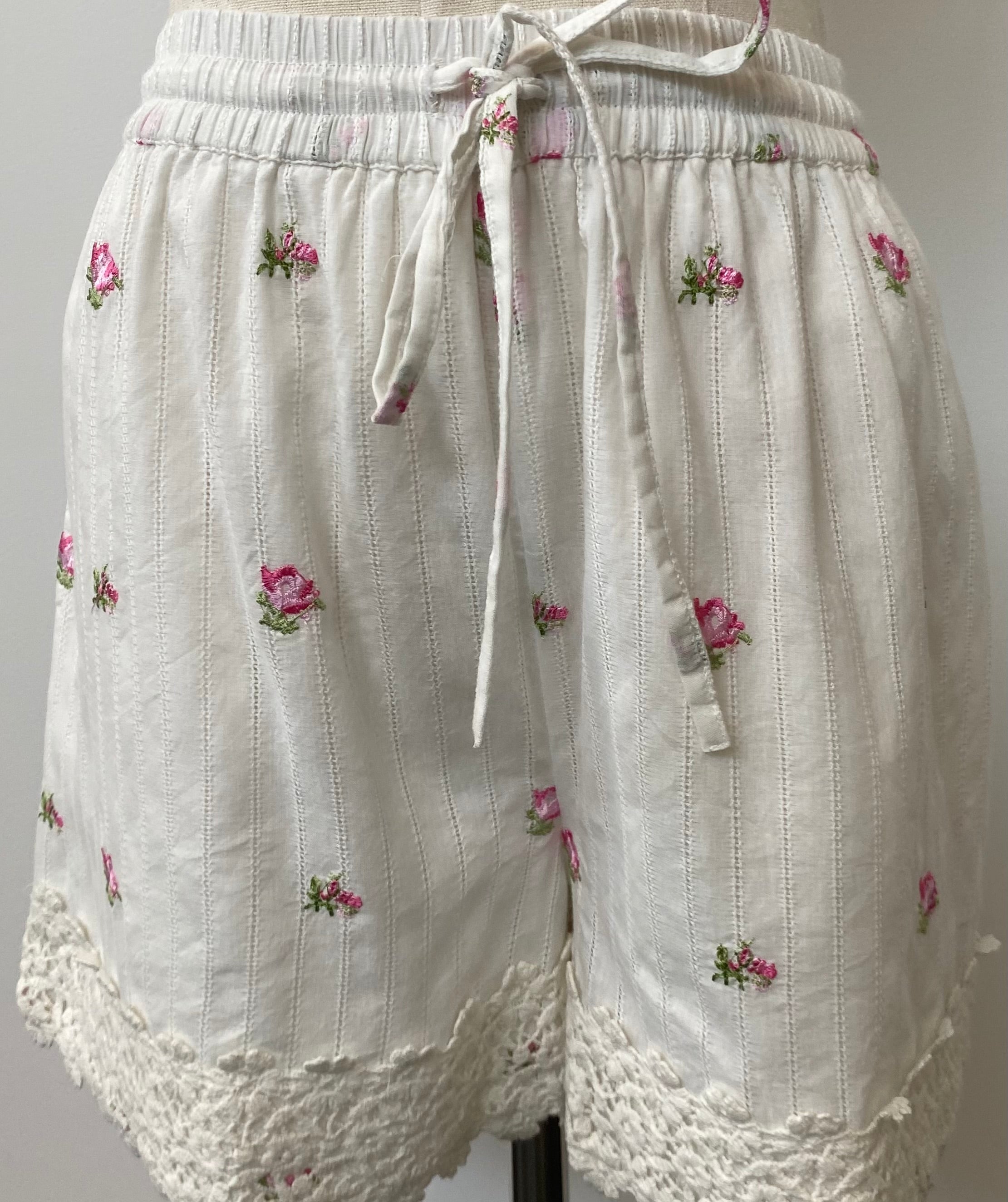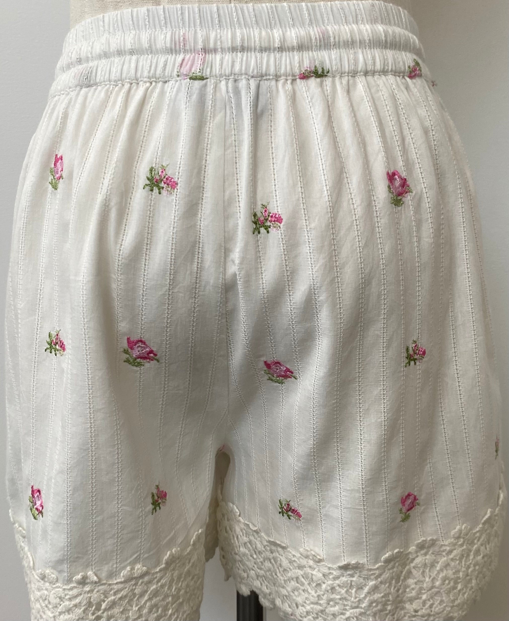 These Pink Rosebud Cotton Shorts feature a charming crochet hem and delicate embroidered rosebuds, adding a sweet touch to your look. The adjustable drawstring ensures a comfy fit, making them perfect for pairing with the matching blouse for a fresh, playful outfit.