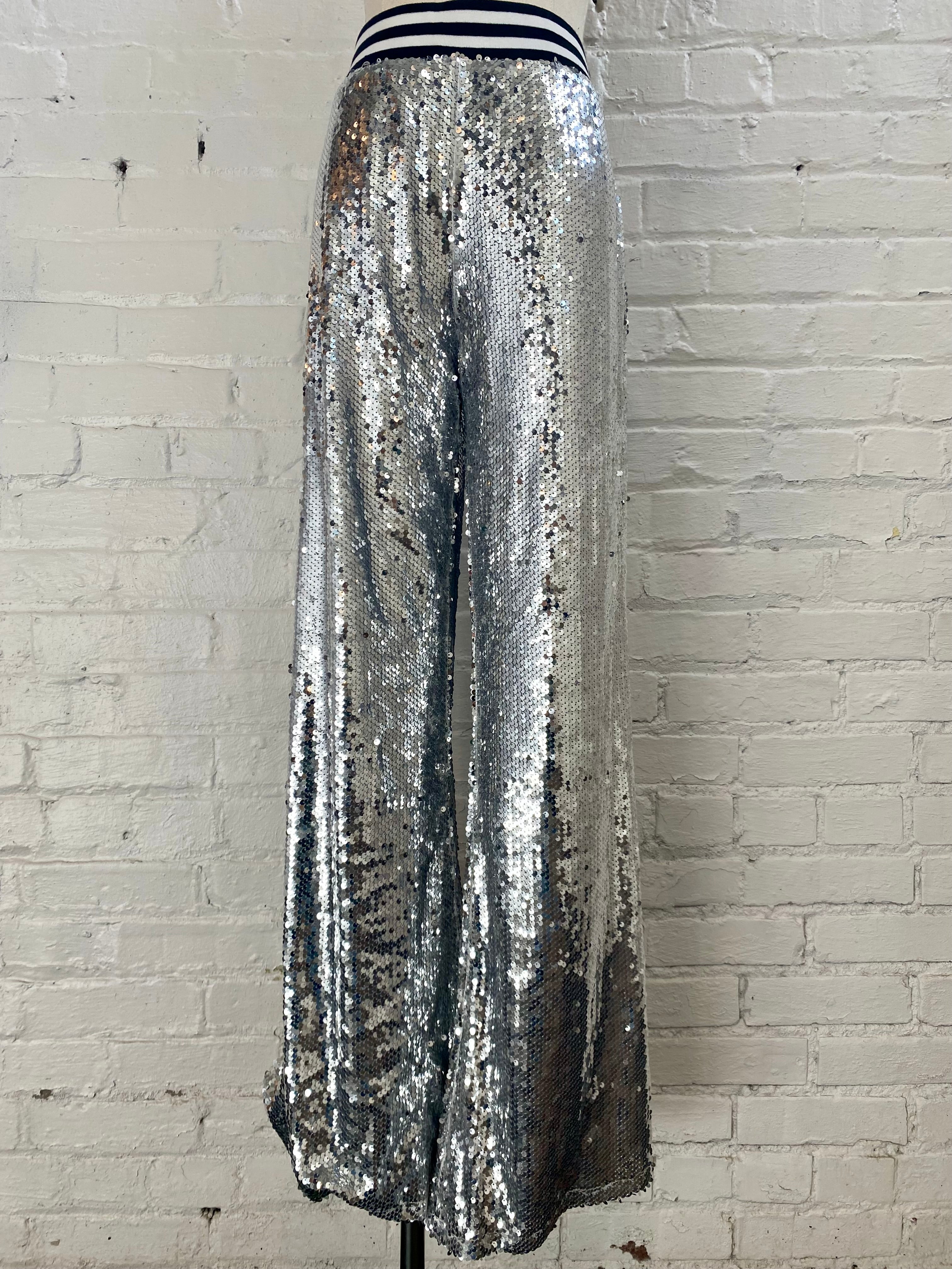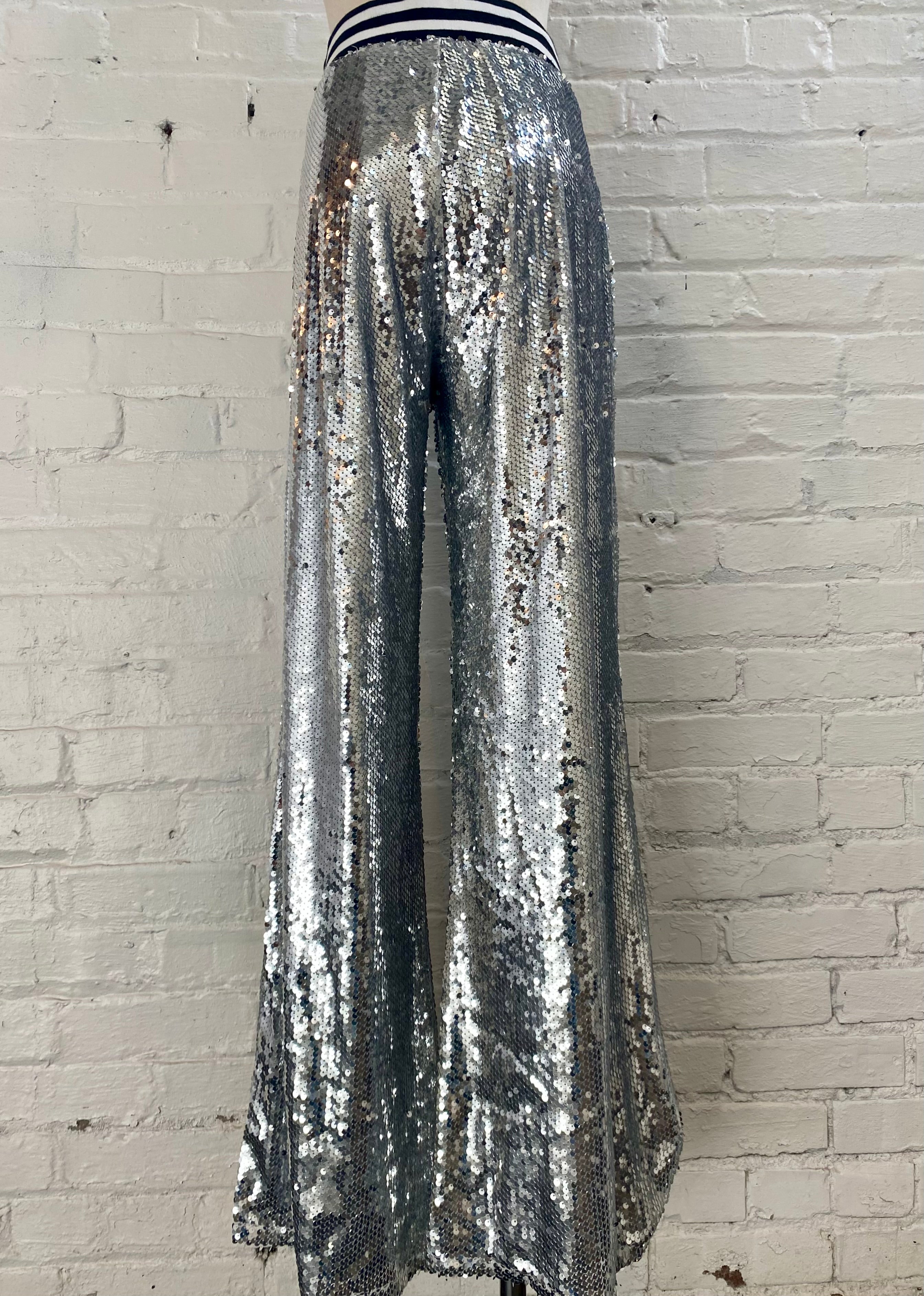 The Elastic Band Wide Leg Sequin Pant is the perfect choice for any fun holiday style. With a sparkly sequin fabric and a trendy wide leg cut, these pants will make a statement at any event. The striped waistband adds a touch of fashion and elevate your wardrobe with these must-have pants.