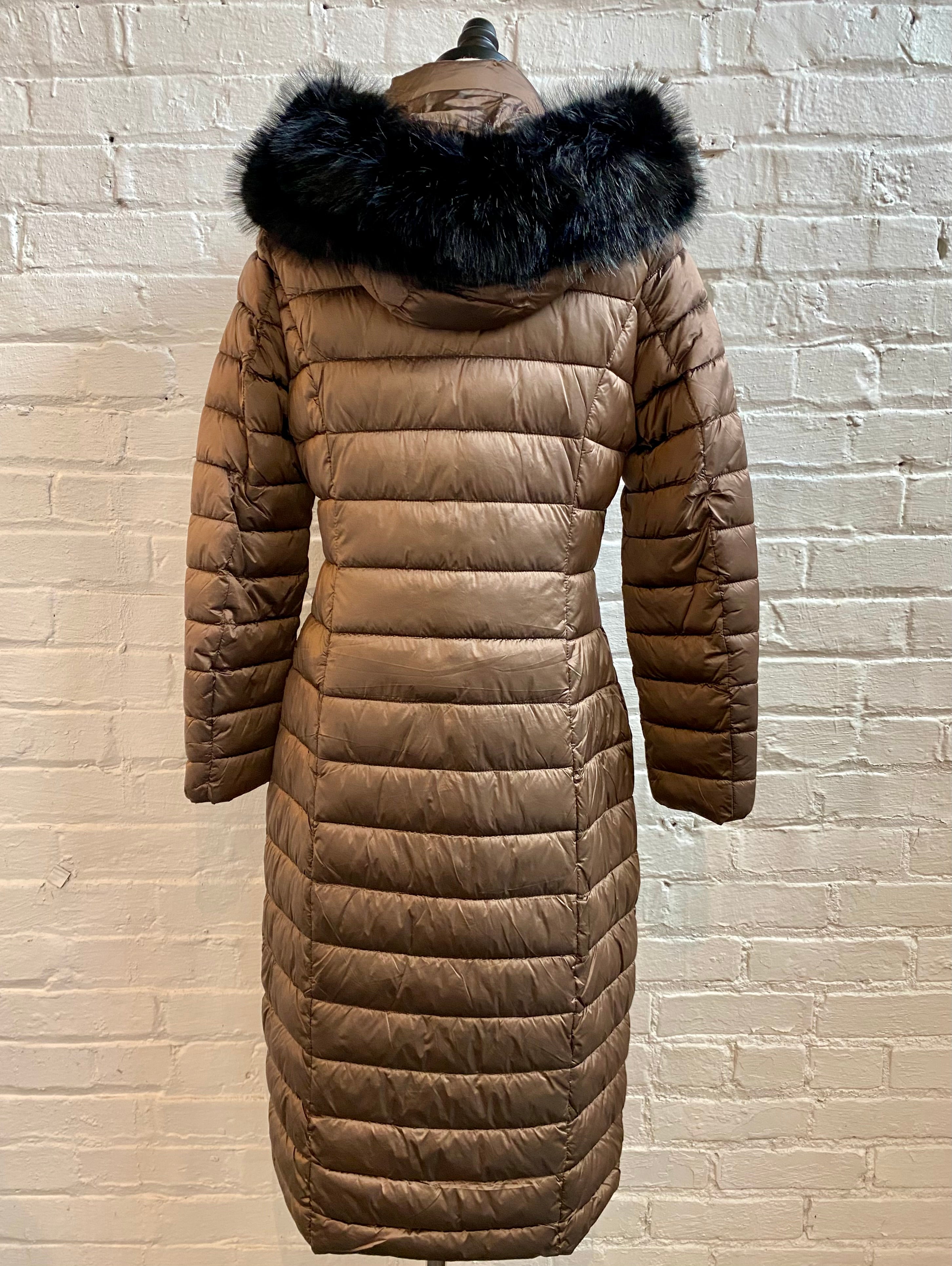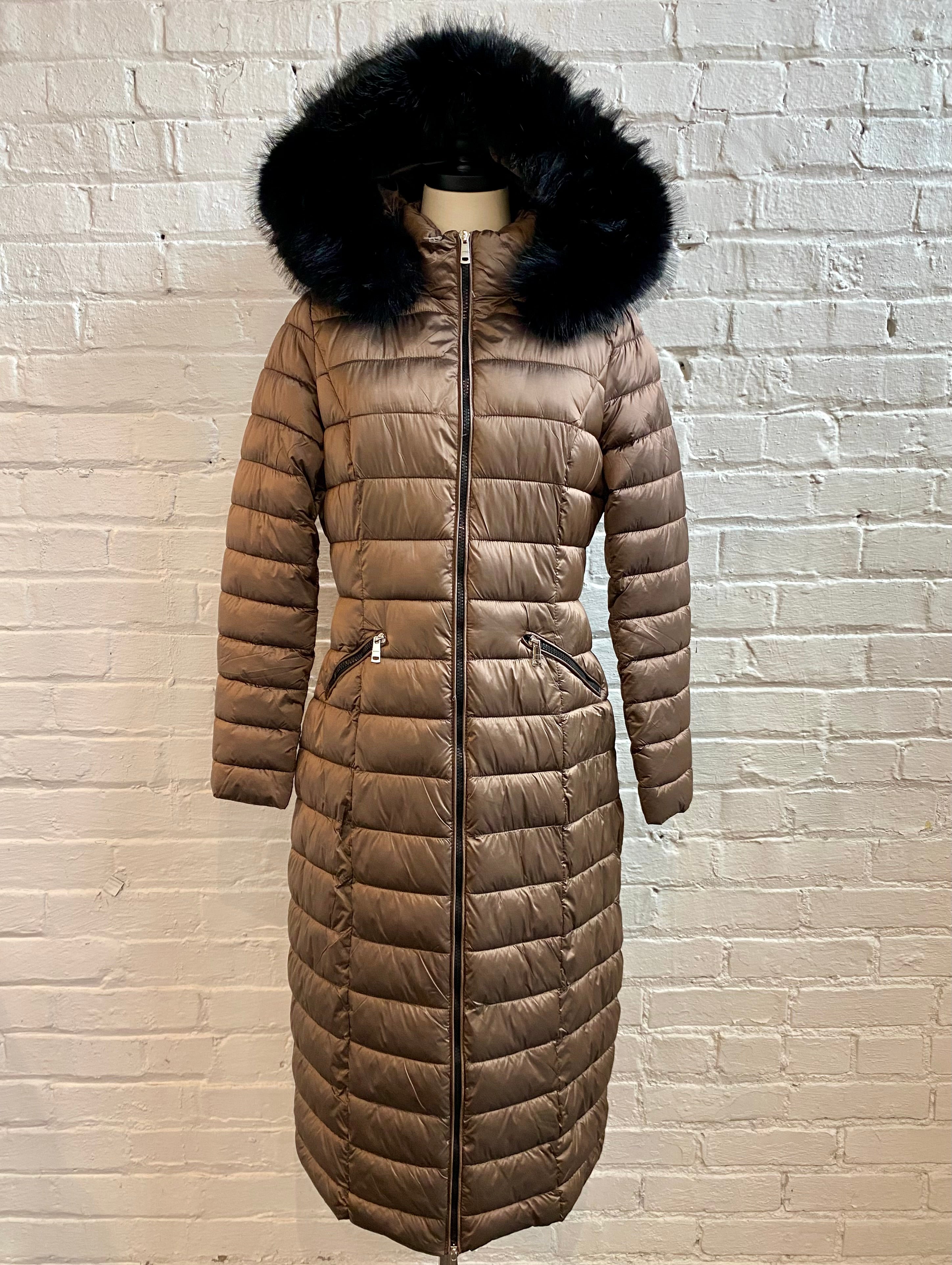 Long Metallic Puffer Jacket with Removable Fur Trim and Hood