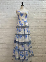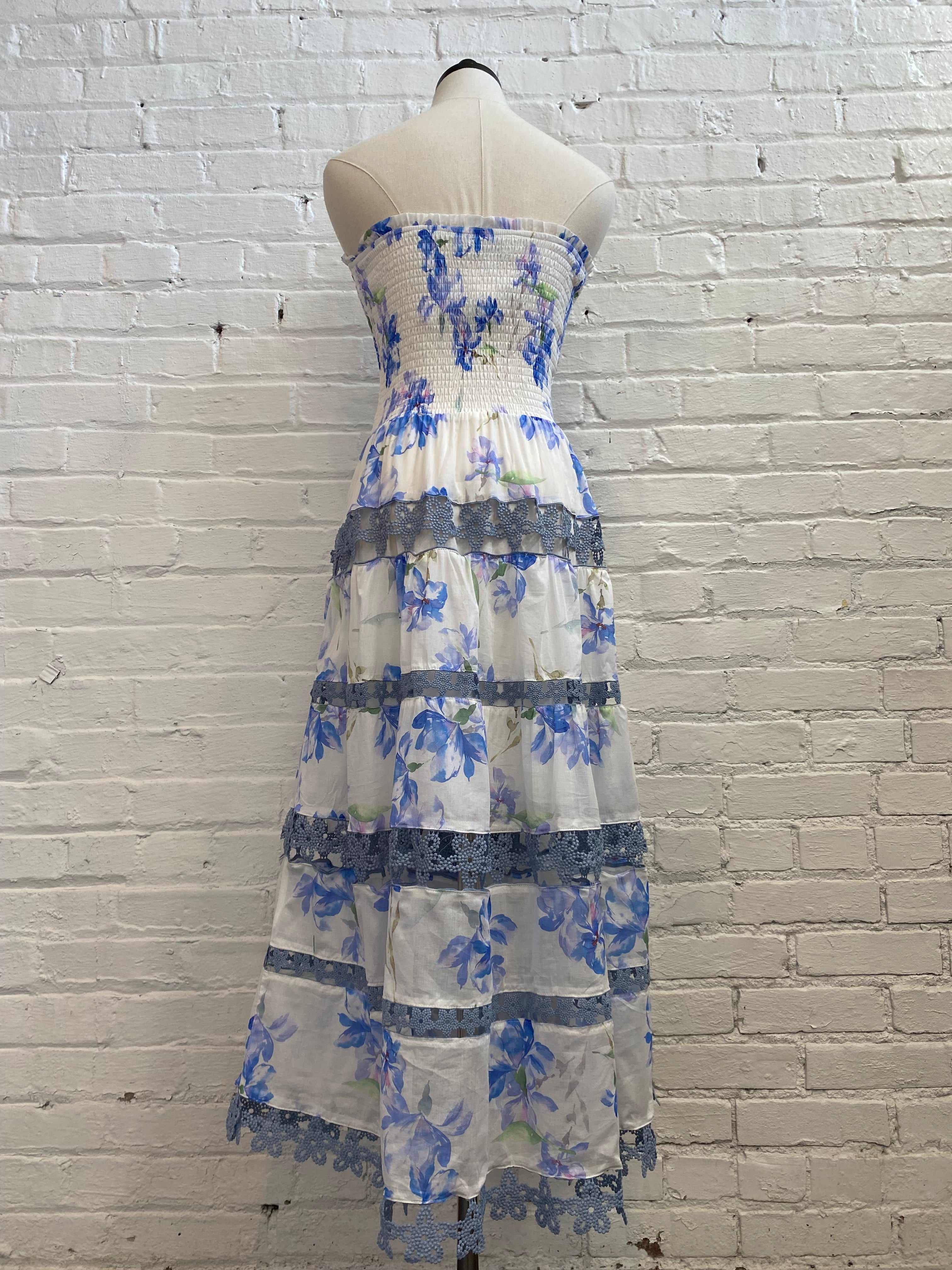 Elevate your wardrobe with this best-selling midi dress featuring a captivating blue floral print. Delicate lace trim edges the layered fabric, creating an elegant silhouette perfect for any season. This stunning piece combines timeless style with modern sophistication—a customer favorite that consistently sells out. Don't miss your chance to own this coveted design.