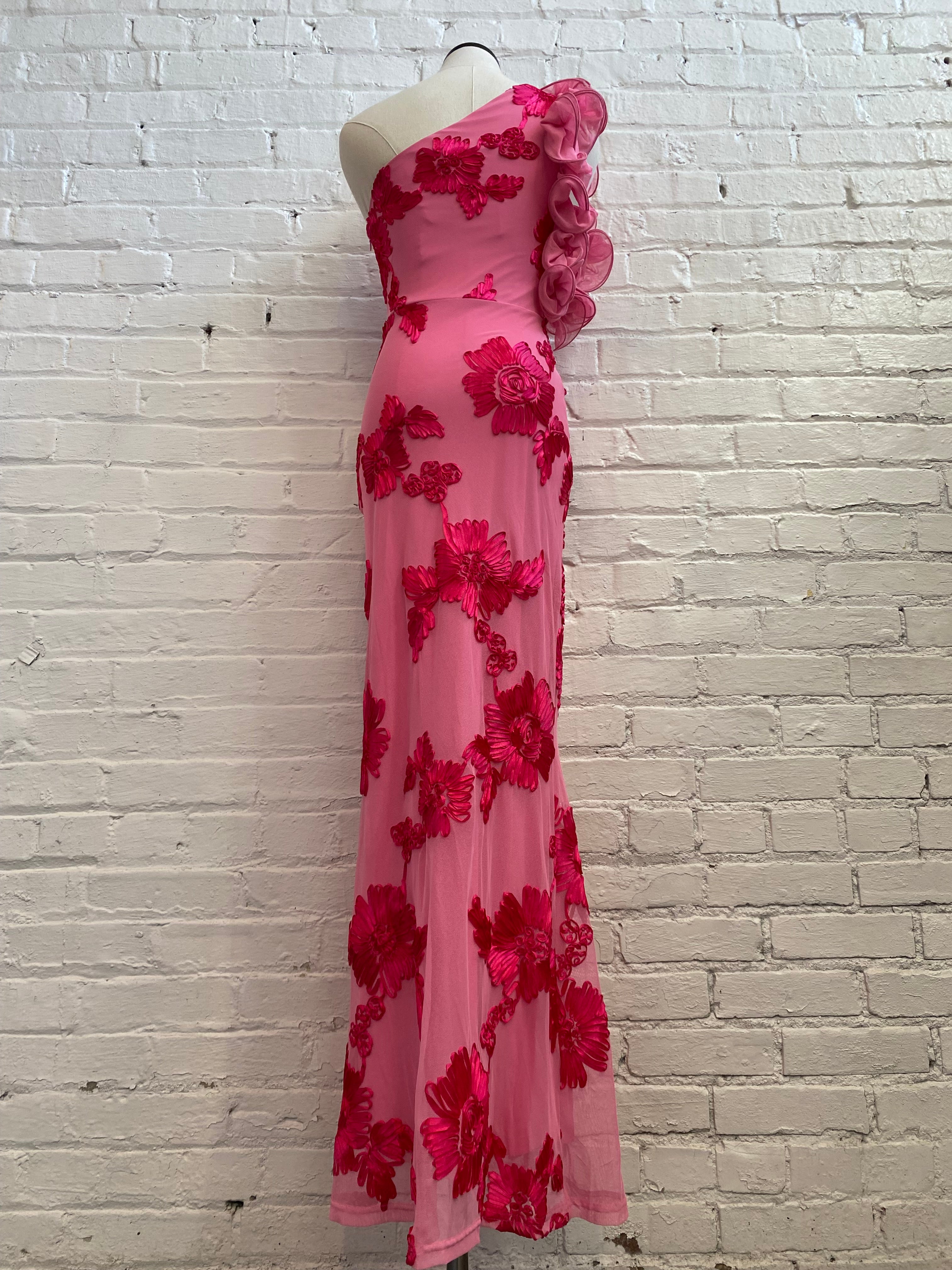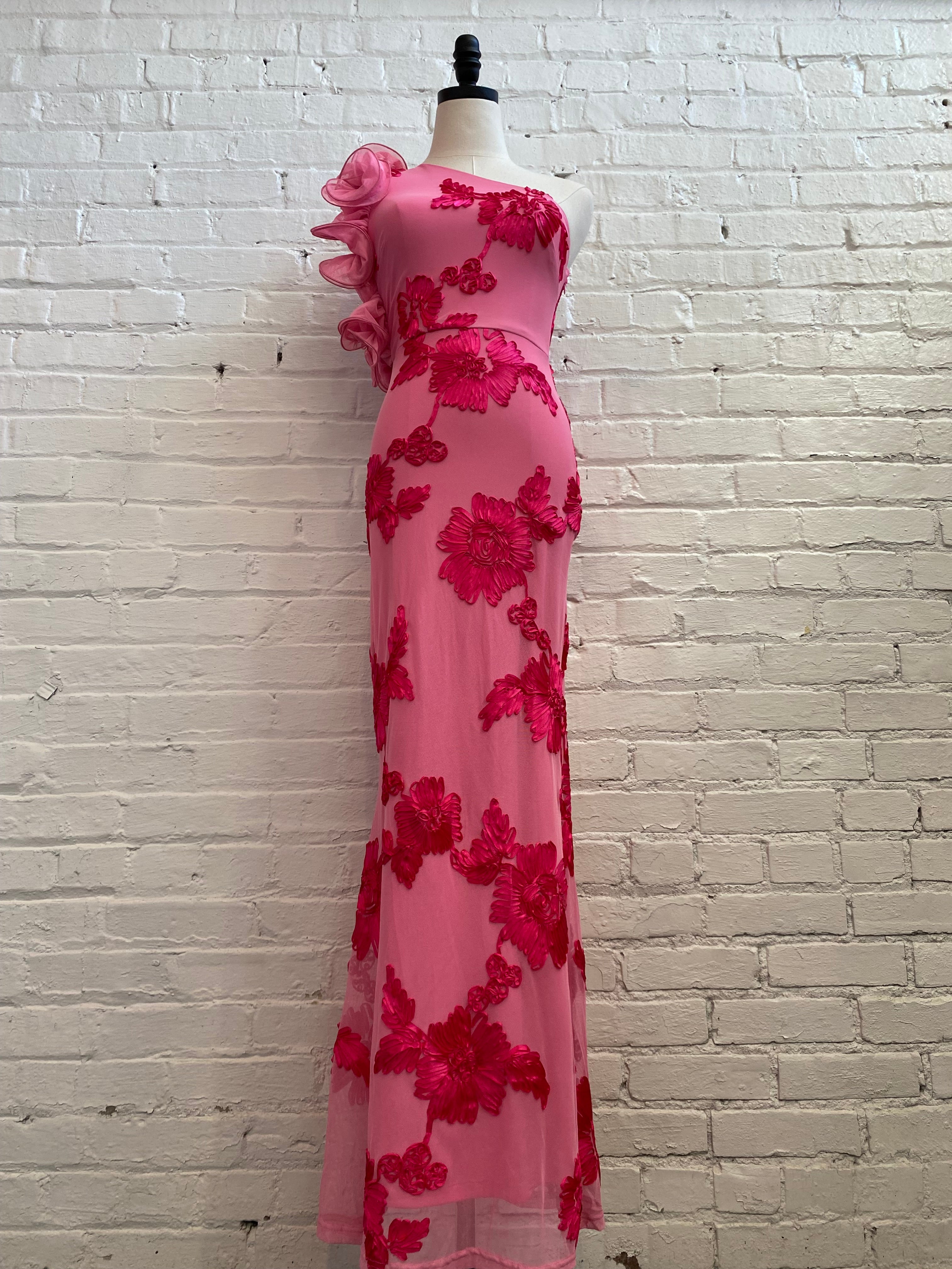 Make a statement at your next event in this one-shoulder evening dress featuring dimensional floral appliqués in striking pink and red tones. The delicate mesh overlay adds movement and sophistication, creating an eye-catching silhouette perfect for weddings and special occasions. An effortless showstopper that balances elegance with bold color.