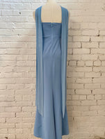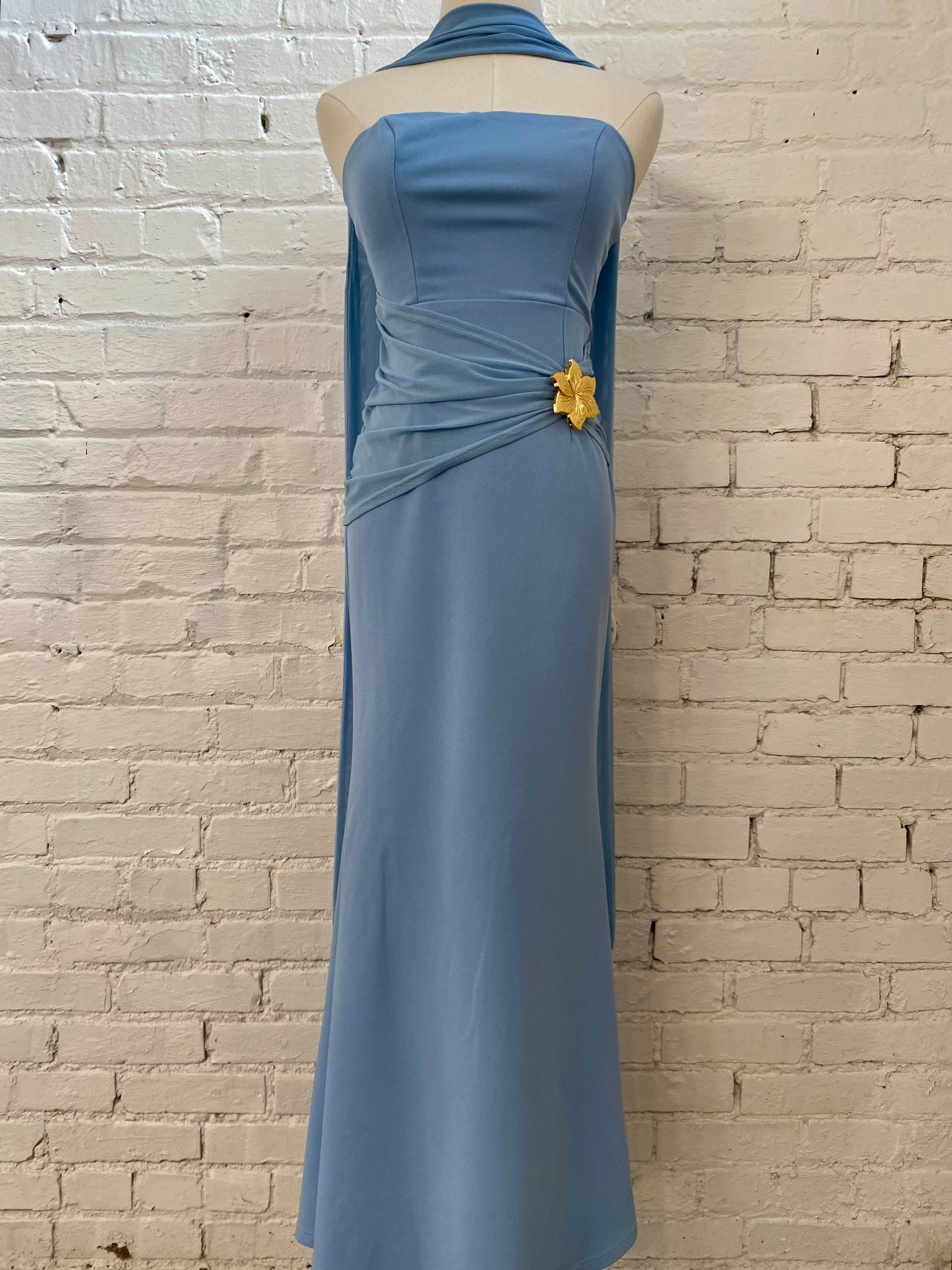 Elevate your wedding guest look with this stunning strapless blue dress, featuring an eye-catching side gold flower embellishment that adds sophisticated flair. The flowing silhouette and striking neckline create an elegant, fashion-forward appearance perfect for special occasions. The delicate gold adornment draws the eye and sets this piece apart, making it an unforgettable choice for any formal event.