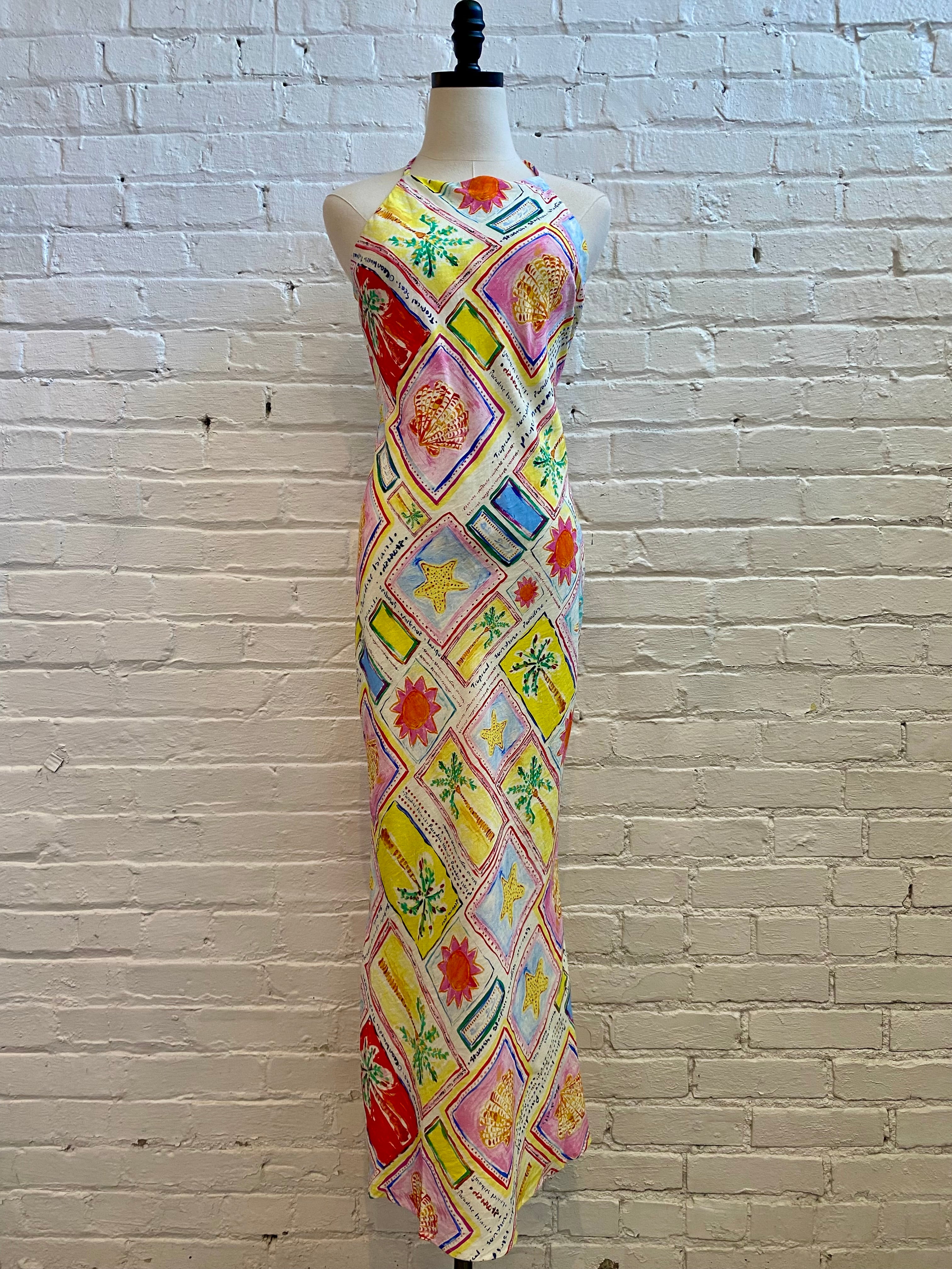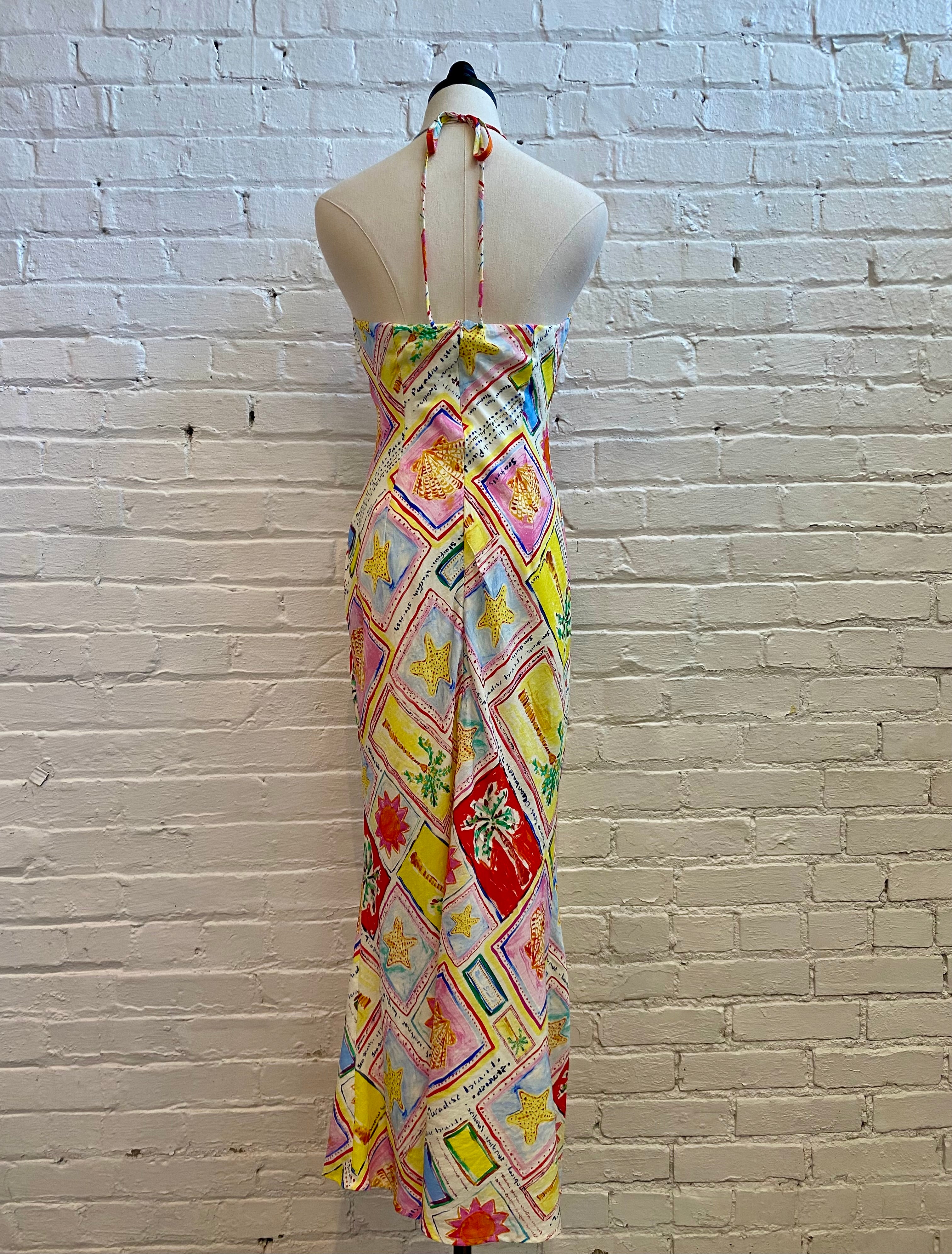 Escape to paradise in this stunning tropical print halter maxi dress. Designed for the style-conscious traveler, this chic piece features a flattering halter neckline and flowing silhouette perfect for summer getaways and elegant soirées. The vibrant tropical fabric is a season must have and drapes beautifully, offering both comfort and sophistication for your next vacation adventure. Whether you're lounging beachside or attending an evening event, this dress effortlessly transitions from day to night with timeless appeal.