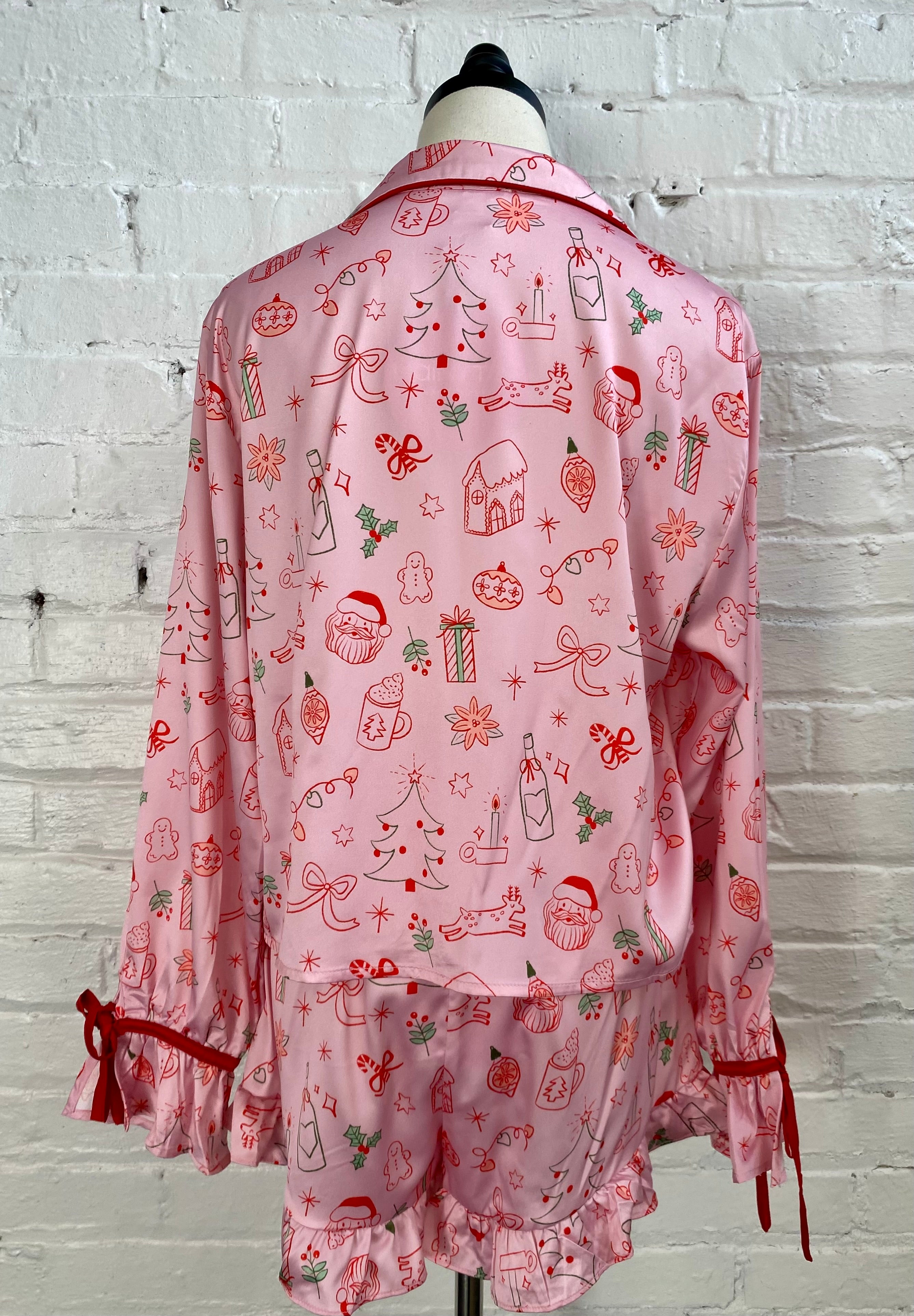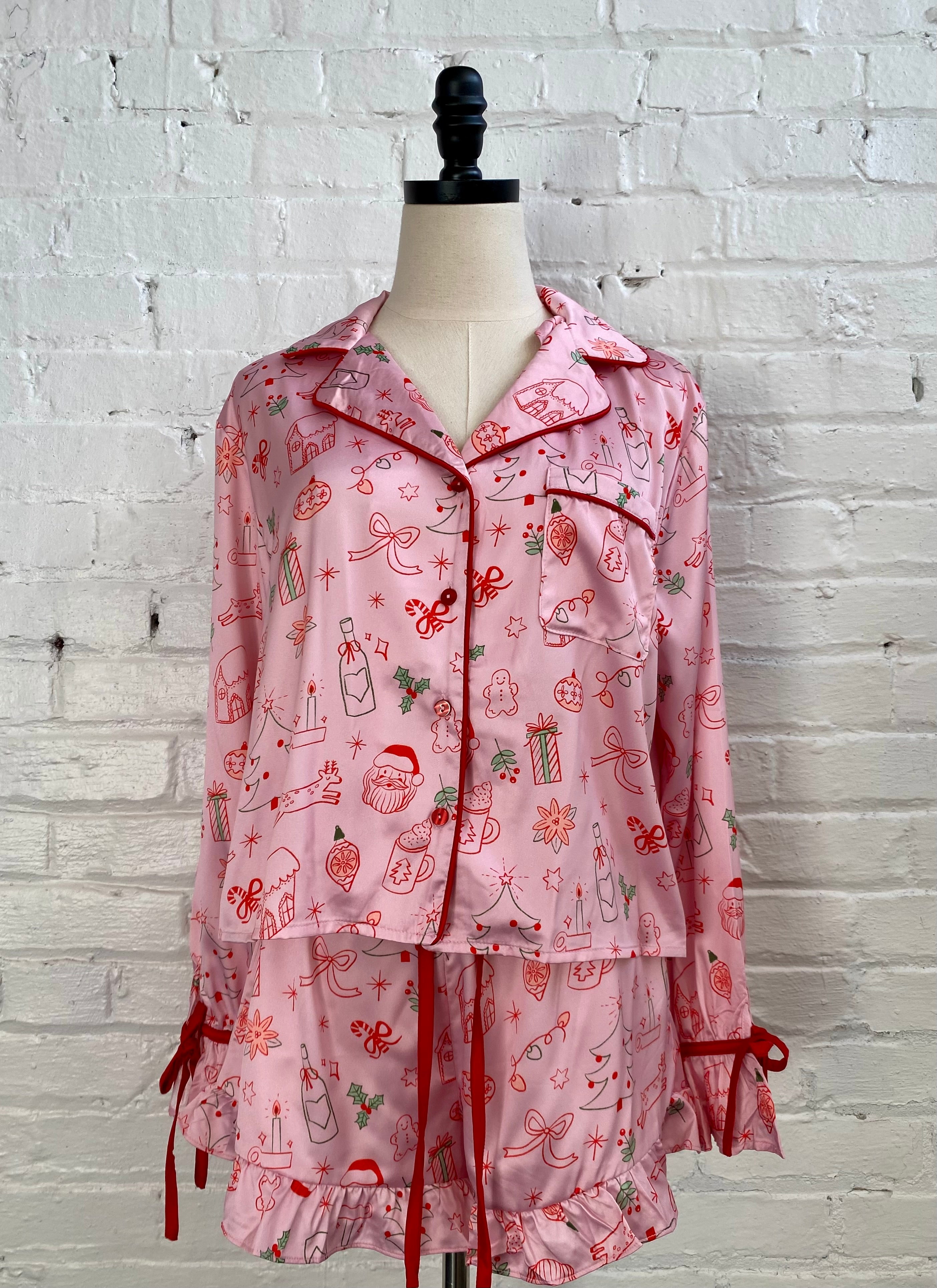 Spread holiday magic in these delightful pink Santa pajamas! Designed for festive fun, this set pairs a cheerful Santa print with comfortable shorts accented by a playful ruffle hem and satin ties. Whether you're opening presents on Christmas morning or lounging through the season, these jammies deliver cozy style with a dash of seasonal spirit. An ideal gift for anyone who loves celebrating the holidays in comfort and charm.