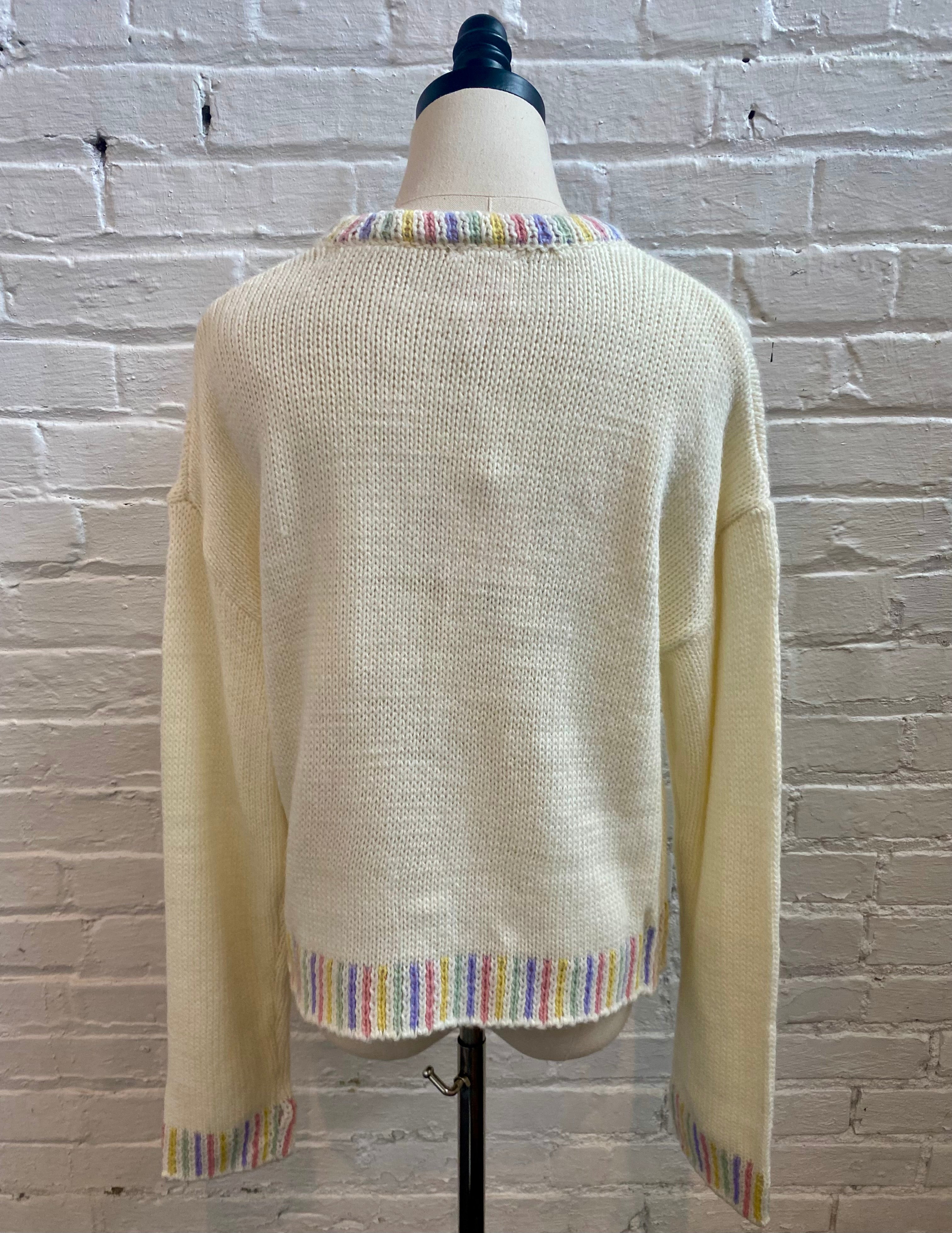 Get into the holiday spirit with this delightful MERRY Holiday Sweater! Bright red yarns spell out the season's favorite word in charming script, while matching pastel accents on the collar, cuffs, and waistband tie the whole look together. It's the perfect blend of fun and festive—ideal for spreading smiles at holiday celebrations or keeping cozy during winter days. This sweater captures all the joy of the season in one wearable package. Pure holiday happiness!