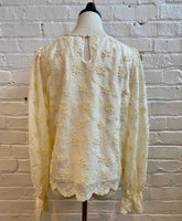 Step into boho bliss with this enchanting scallop-edged blouse that whispers vintage romance. Dimensional florals bloom across the fabric, bringing garden-fresh character to your everyday wardrobe. The playful scalloped bottom and at the wrists adds a touch of whimsy, while the relaxed silhouette lets you move with ease and grace. Perfect for those who crave effortless style with personality—layer it, tie it, or let it shine solo. Your new go-to piece for carefree days and breezy nights.