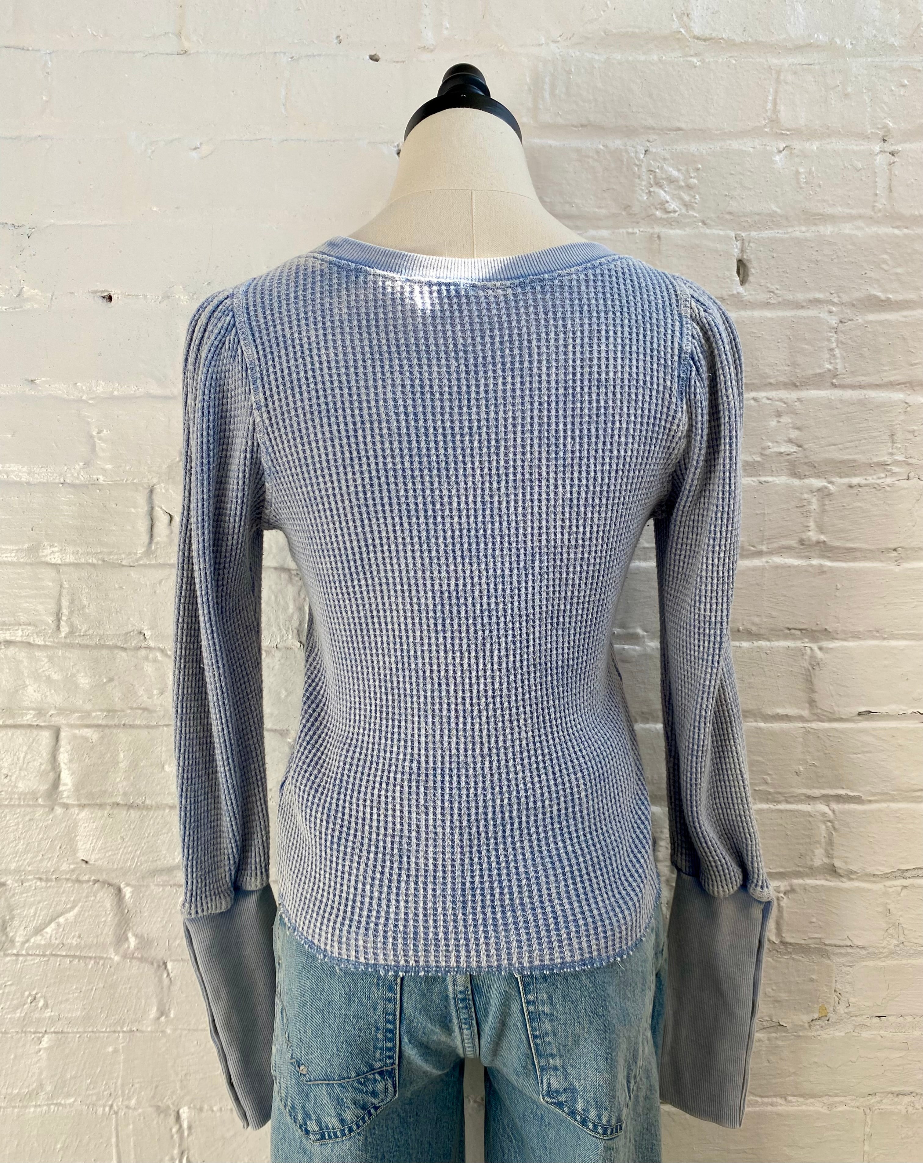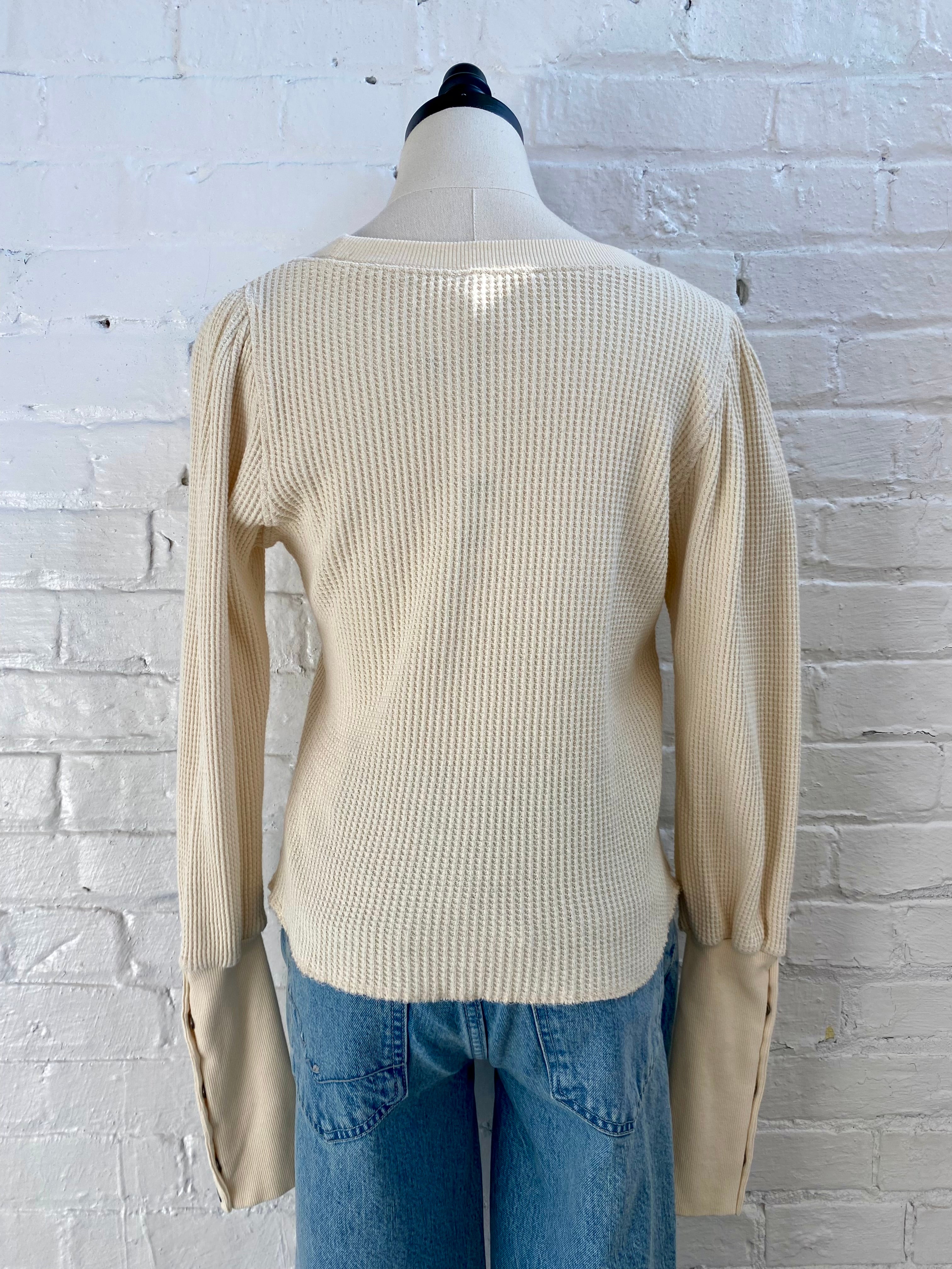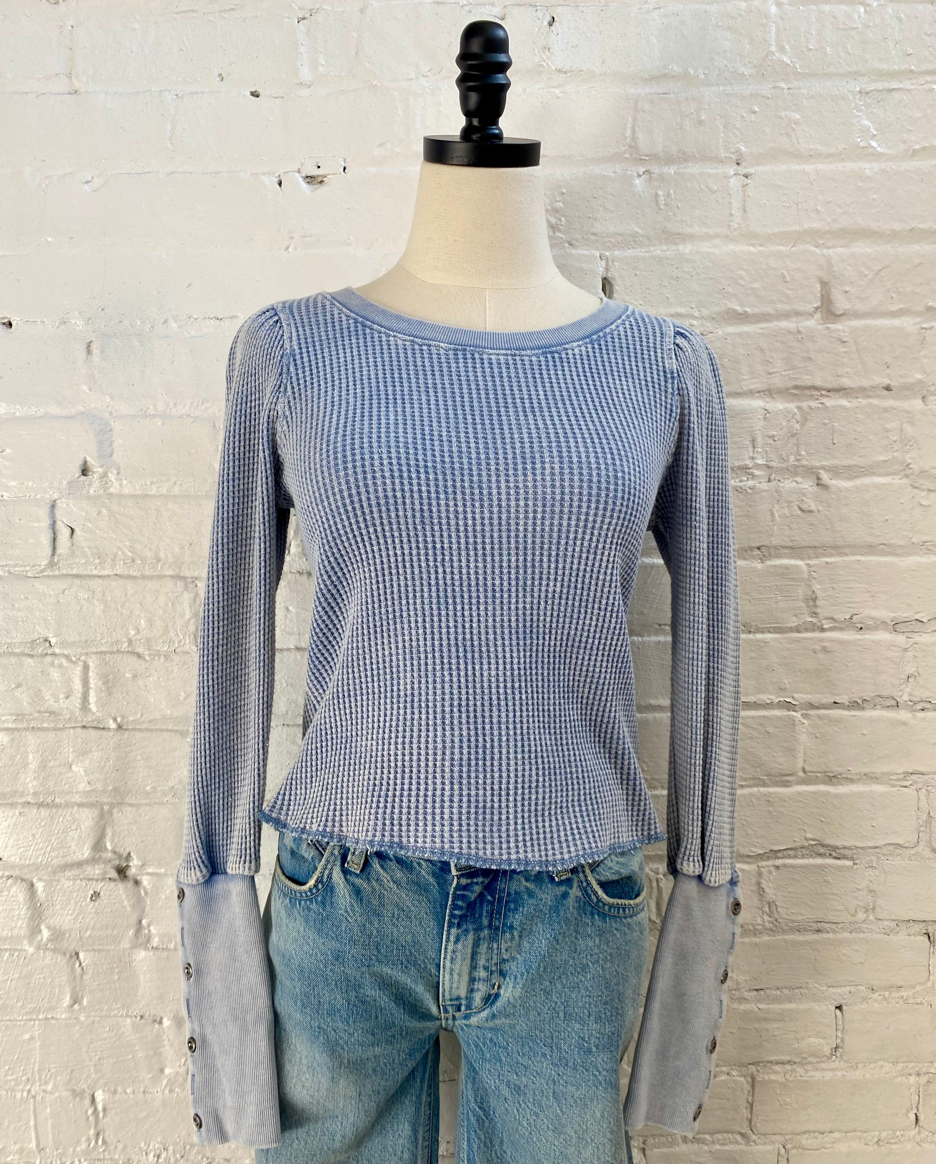 Elevate your everyday wardrobe with this waffle knit top, featuring distinctive puff sleeves and ribbed cuffs for a polished finish. The textured waffle fabric adds visual interest and dimension, while the long sleeves provide versatile layering options. Available in classic blue or ivory, this piece transitions seamlessly from casual to dressed-up occasions.