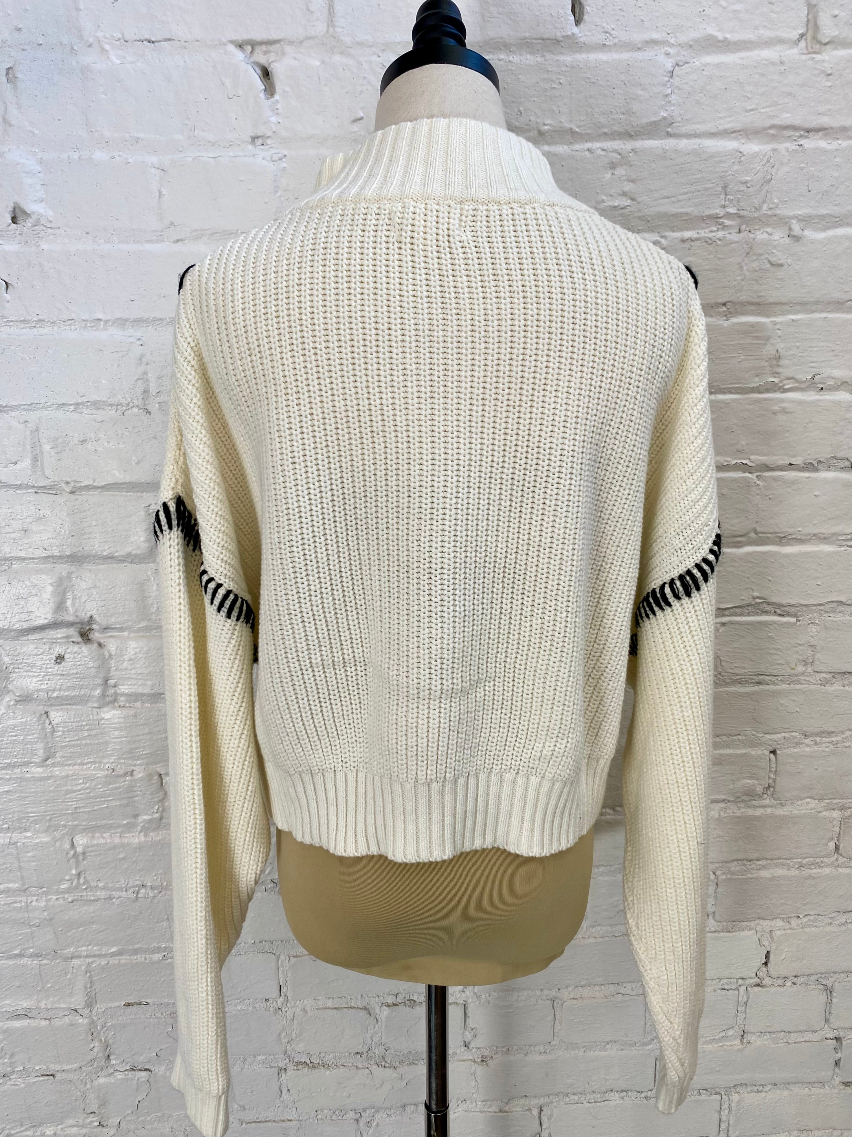 Throw on this cozy half zip and become a sweater season MVP. The whip stitch detailing adds a touch of texture and visual interest, while the shorter length keeps things modern and versatile. Perfect for layering over your favorite tee or pairing with high-waisted bottoms, this piece is ready to become your go-to grab-and-go essential. Comfort meets style in every wear.