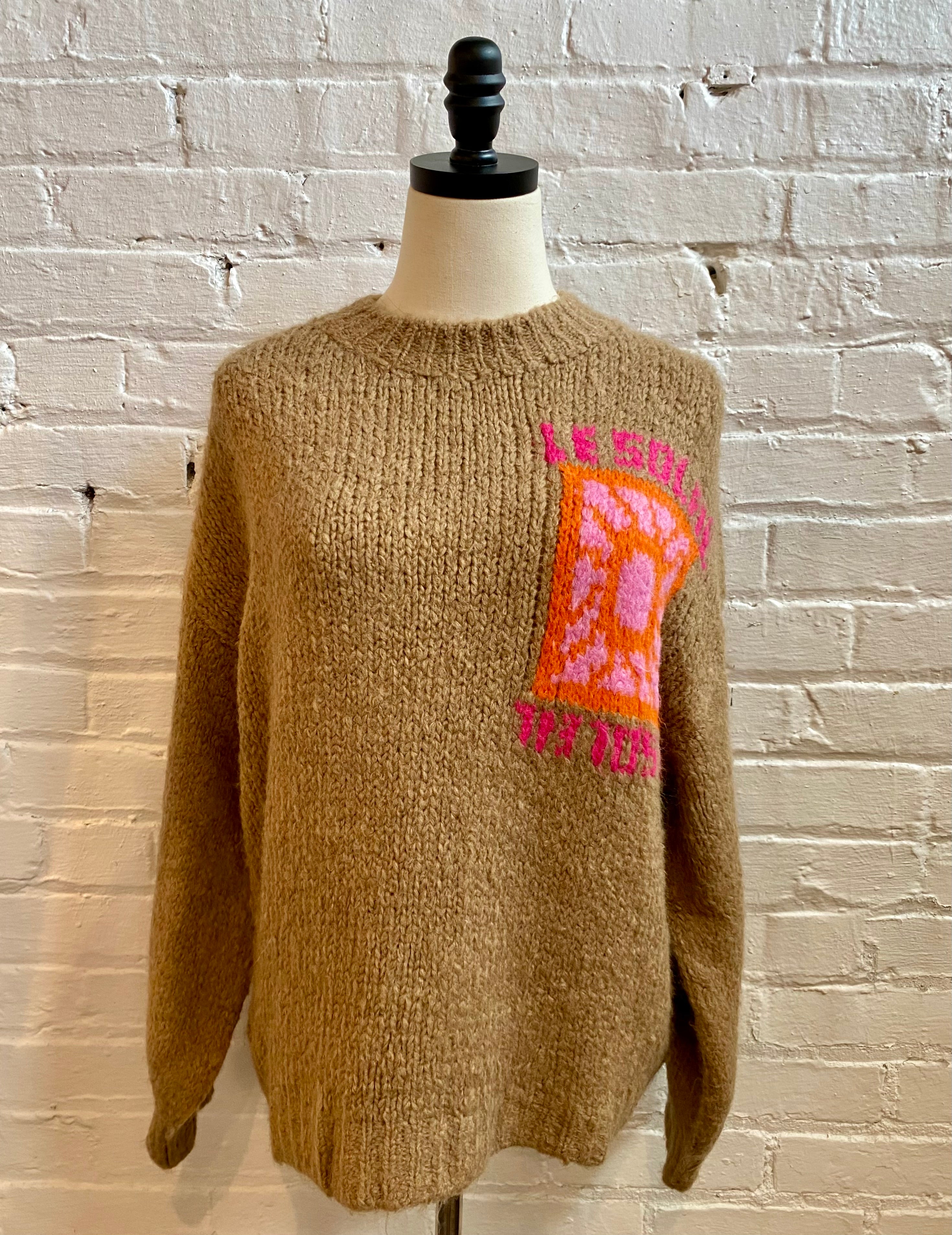 Stay cozy and stylish in the Camel Jacquard Print Sweater from Vintage Havana. Featuring a soft, fuzzy feel and a handmade touch, its Soleil graphic and front pocket add charm and practicality. Perfect for playful layering on chilly days, this sweater blends comfort with eye-catching design effortlessly.