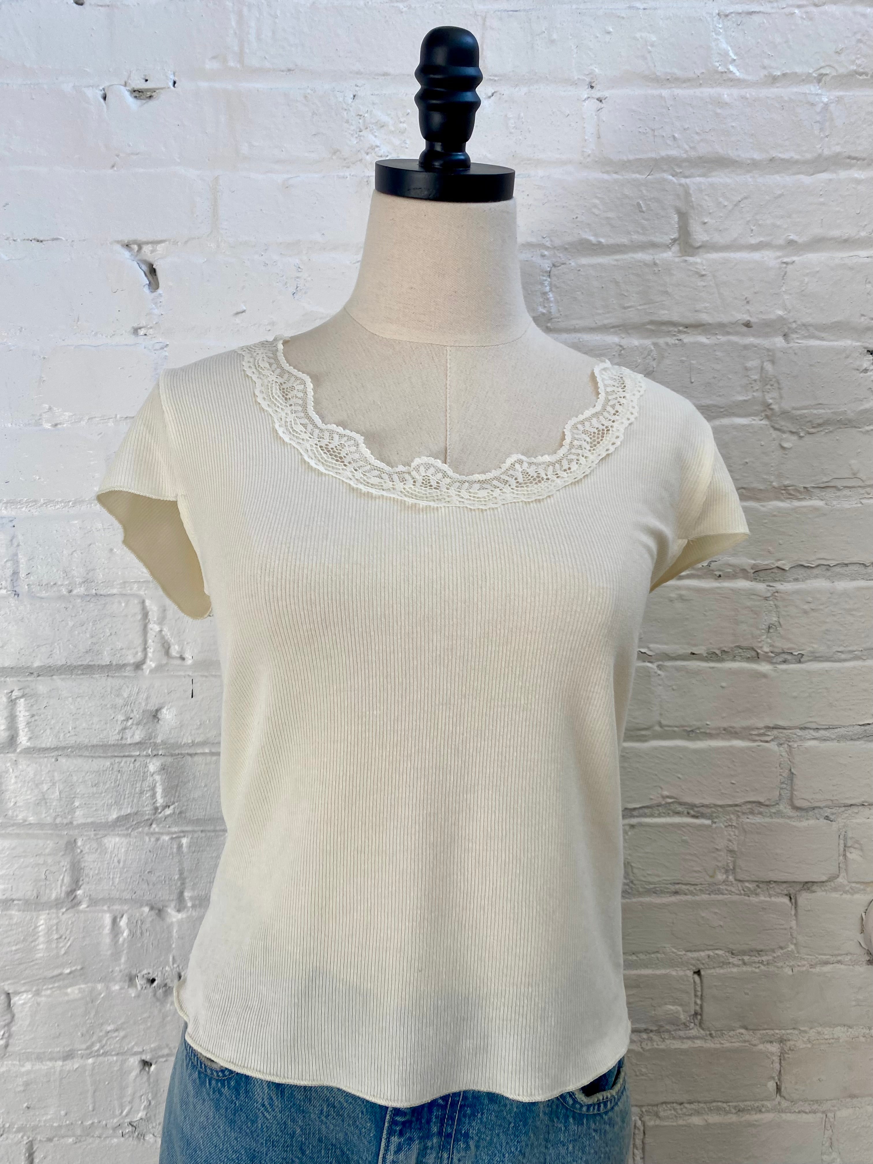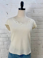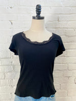 Summer fun meets timeless style with this scoop neck lace top. Crafted with delicate lace trim detailing, it transitions seamlessly from casual days to date night. The short sleeves offer breathable comfort for warm weather, while the refined neckline flatters any silhouette. Choose between creamy ivory or classic black to match your personal aesthetic..