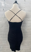 Turn heads in the Ruched Bodycon LBD, designed to hug your curves with its soft jersey fabric. The playful criss-cross back adds a flirty twist, making it perfect for nights out or special occasions where you want to shine effortlessly.
