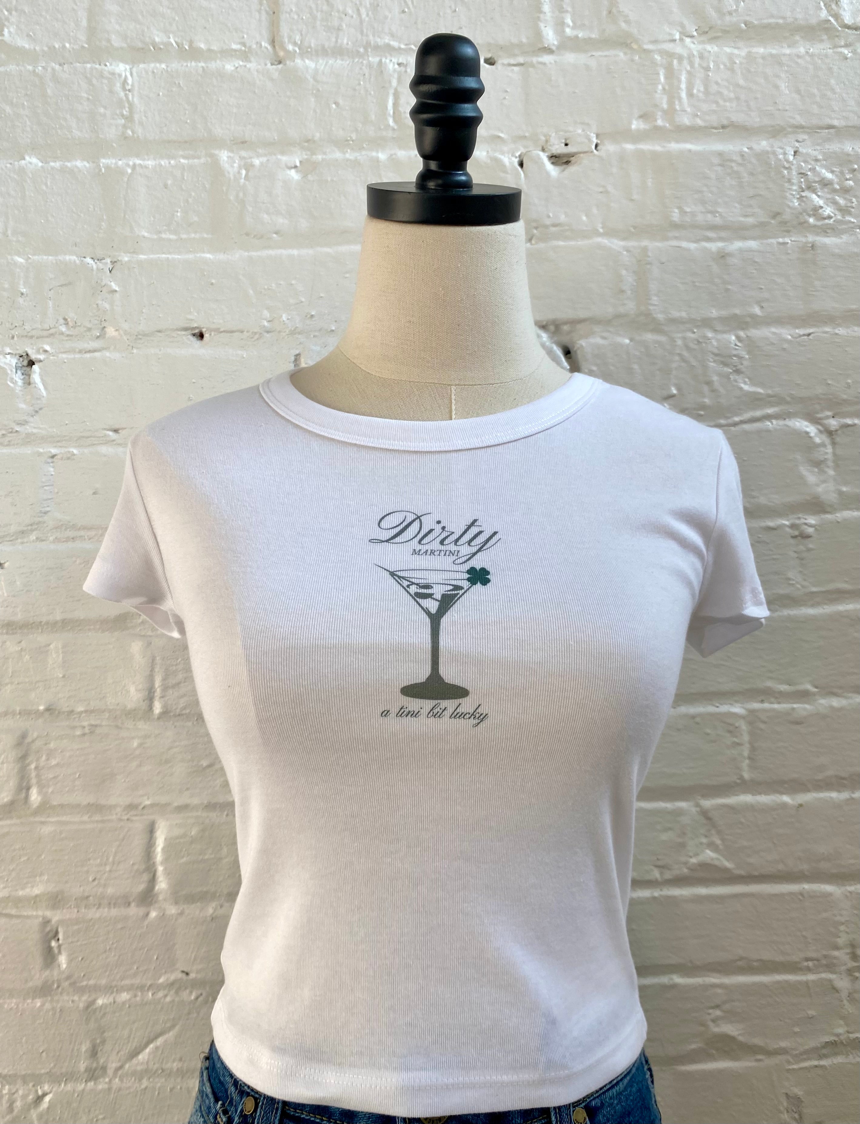 Celebrate St. Patrick's Day with playful style in this fun baby tee. Perfect for casual spring wear, this lightweight tee features a cheeky martini design that brings festive flair to your seasonal wardrobe. Whether you're heading out for the holiday or just embracing the luck of the season, this tee delivers comfort and personality in one easy-to-wear piece.